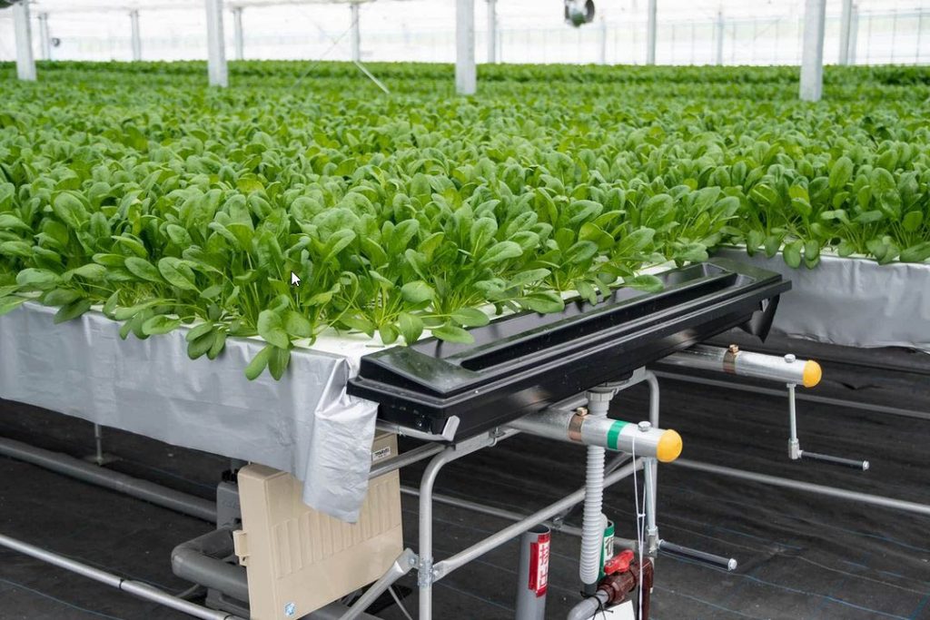 ホウレンソウは、NO3-NとKを多く吸収し、Ca吸収は少ない。見かけの吸収濃度を求めると、概ねNO3-N:16me、P:4me、K:12me、Ca:4me、Mg:4me/lとなる。これを目安に液肥(ハイテンポ)で調整する(原水成分を加味する)。